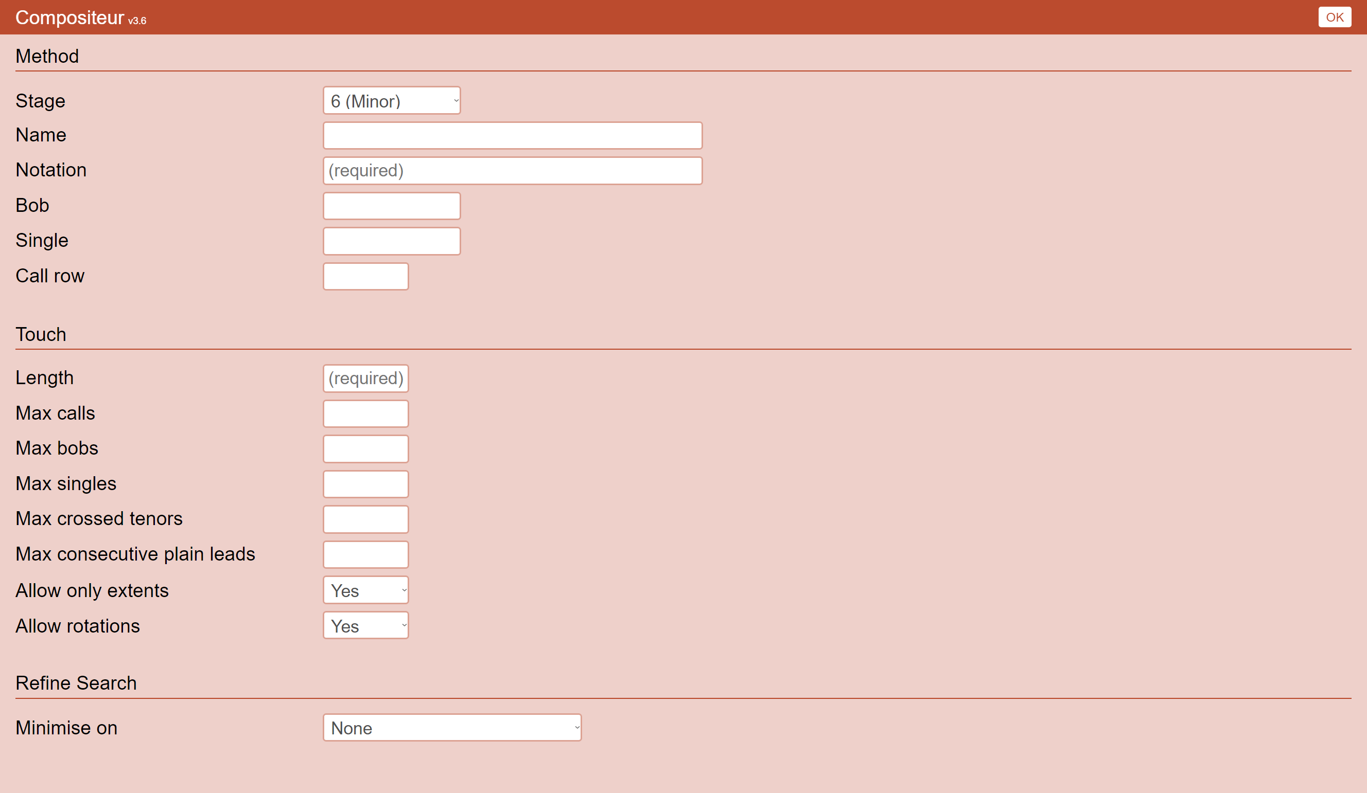 If you know the name of your method enter it in the Name box. If the name matches methods in the Central Council library a drop down list will show. Select the method you want. If a drop down does not appear there is no method with that name in the library.