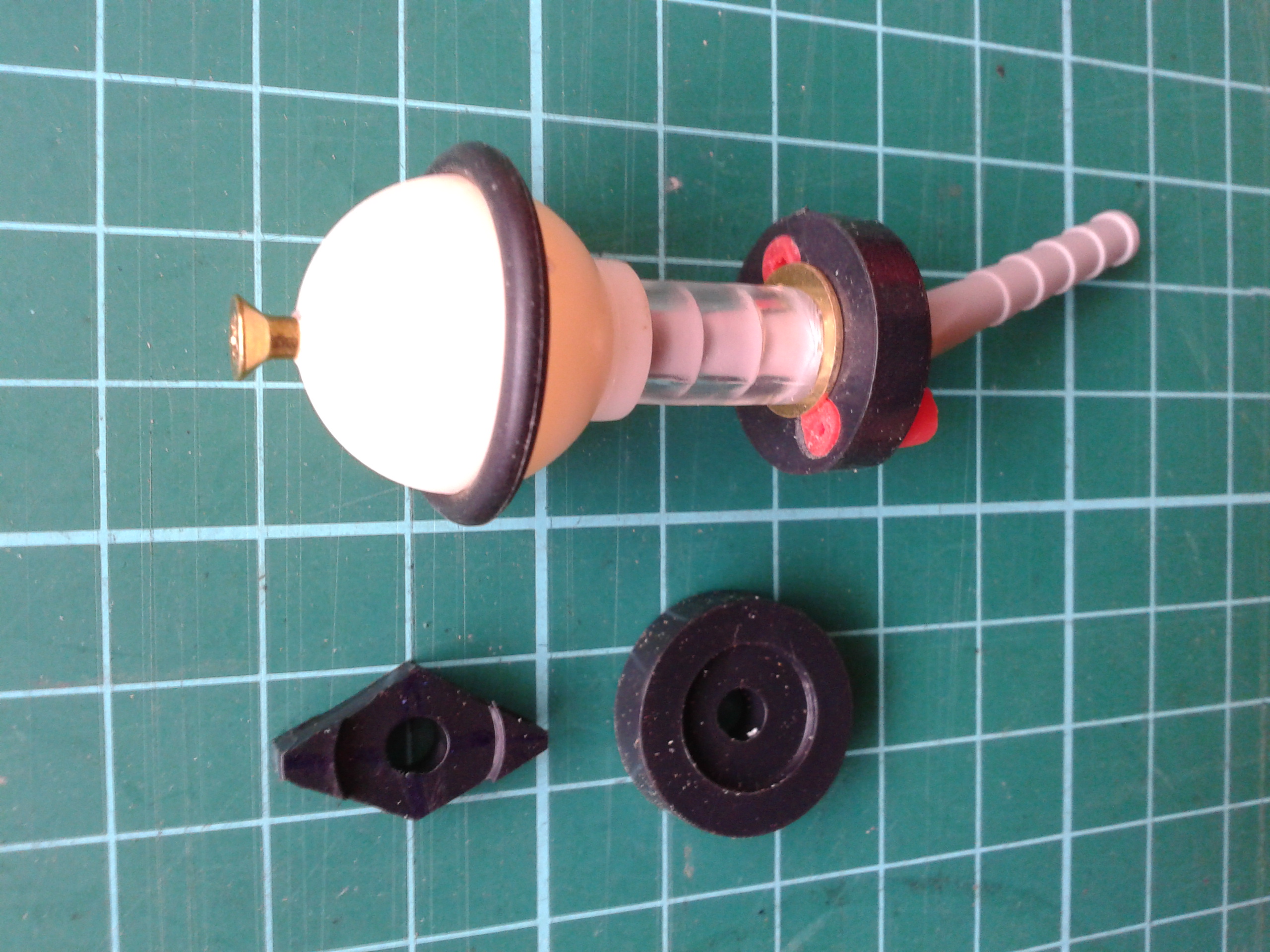 1) My local hardware supermarket didn't stock rubber tap washers. The washers available appeared to be made of a black plastic, possibly nylon from the ease with which they accepted a drill bit. When fitted, these black plastic washers did the job, but made an annoying clunking sound, which was particularly noticeable at handstroke, when the bells are close to the ears, especially when the O-rings were fitted to the clappers, and the bell sound volume consequently reduced. I tried cutting the moving washer into a diamond shape to reduce its stiffness. This had the added advantage of being able to control the distance between clapper and bell by rotating the diamond on the clapper shaft. However the clunking noise remained. My current design dispensed with the stationary washer. Two 4.5 mm diameter holes were drilled in the remaining washer, and 8 mm lengths of round, 5 mm diameter, catapult elasic tubing, obtained from the internet, were twisted into these holes, with the upper ends flush with the surface of the washer closest to the clapper. The assembly was completed with the addition of a brass washer to help secure the elastic tubing, and a 14 mm length of clear plastic tubing between the brass washer and the clapper ball. With this arrangement, the bells were useable both with and without the O-ring on the clapper, producing a large change in volume, and the annoying clunk was gone.