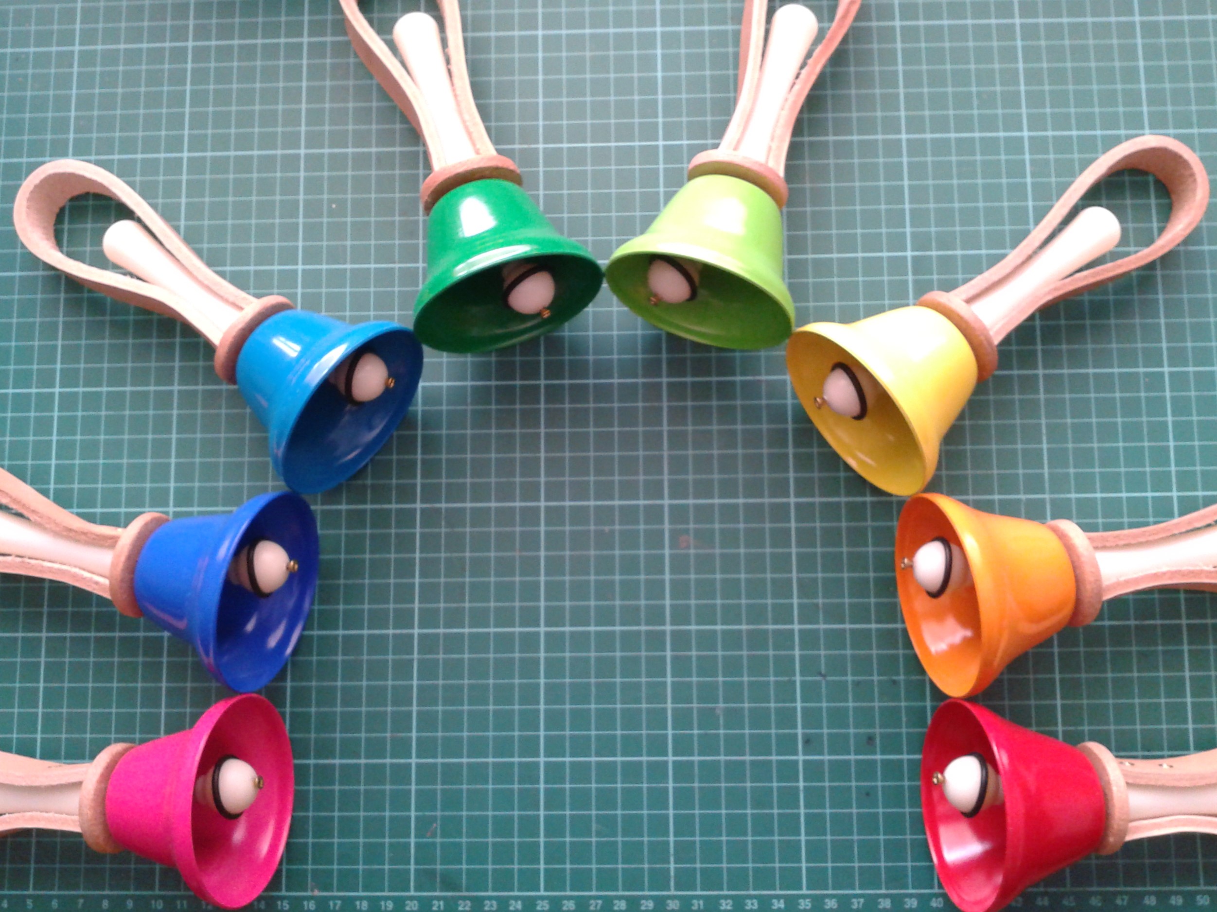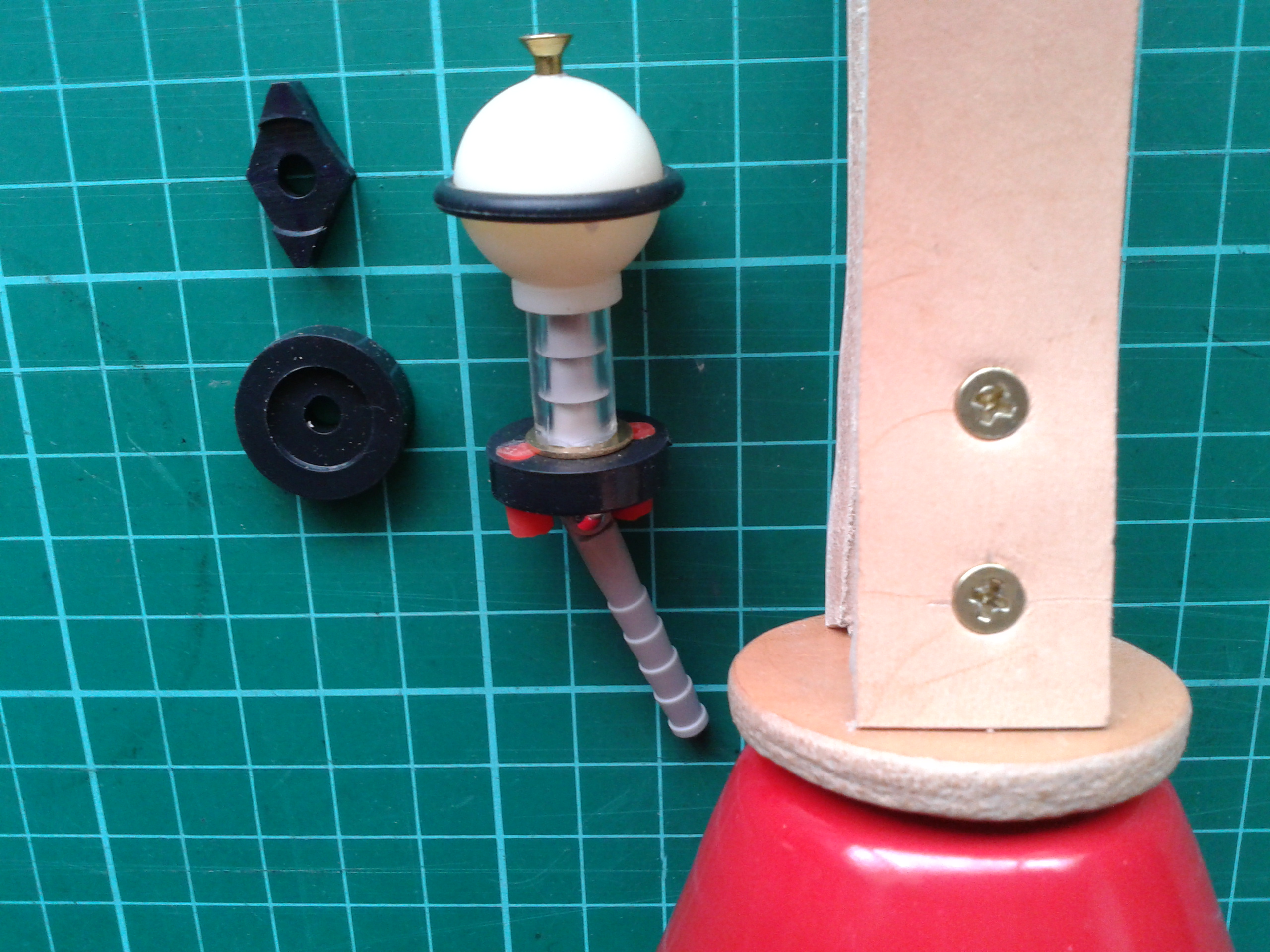 2) I wanted to avoid the use of glue, so that the clapper unit was easily replaceable. The circumferential grooves round the clapper balls to accept the O-rings were cut with a round file used for sharpening chain saws. The clapper ball was fixed to the hinge shaft by drilling separately through the clapper ball with a 2.5 mm drill, and then along the length of the shaft of the hinge with a 2 mm diameter drill. The clapper ball was then secured by means of an 18 mm 4G brass screw trough the clapper ball and into the hinge pin. The hinges proved to be hollow, so an alternative would have been simply to cut the end off the hinge pin. In the finished assembly, the countersunk screw head resembled a brass flight on the clapper ball which was quite pleasing. The leather for the handles was purchased from the local cobbler, and attached to the handle of each bell by four 12 mm 4G plated steel screws. The screws were positioned two on either side of the handle, 10 mm and 25 mm back from the circular leather caps, which were themselves separated from the bell by rubber O-rings as suggested by Simon Gay. The two screws closest to the bell almost made contact inside the plasic handles. These two screws were loosened to fit the clapper assembly, and then retightened into the hinge pin after the clapper assembly was pushed firmly home, thereby holding the clapper in place. .... see photos ...